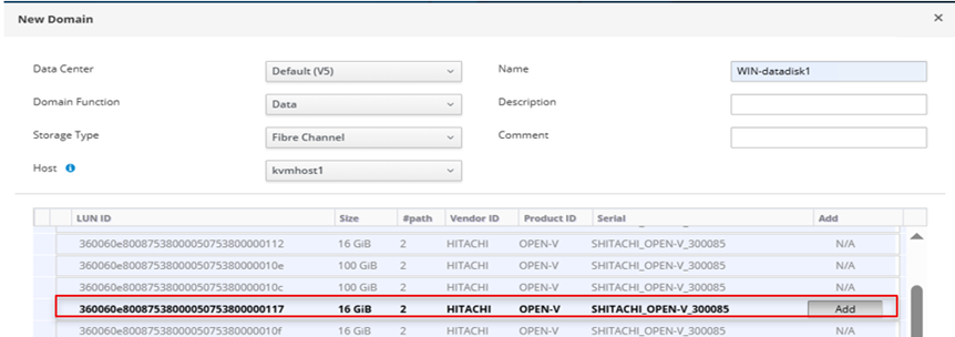 1.      In the Administrative console, navigate to Storage, click on Domains, then click New Domain tab. In the New Domain menu, input data as shown in the screenshot and select the Hitachi VSP LUN to use for creating the domain. Click on OK.
