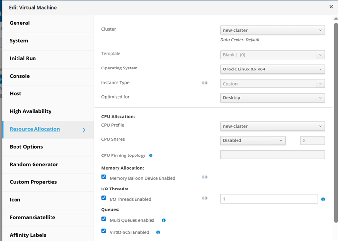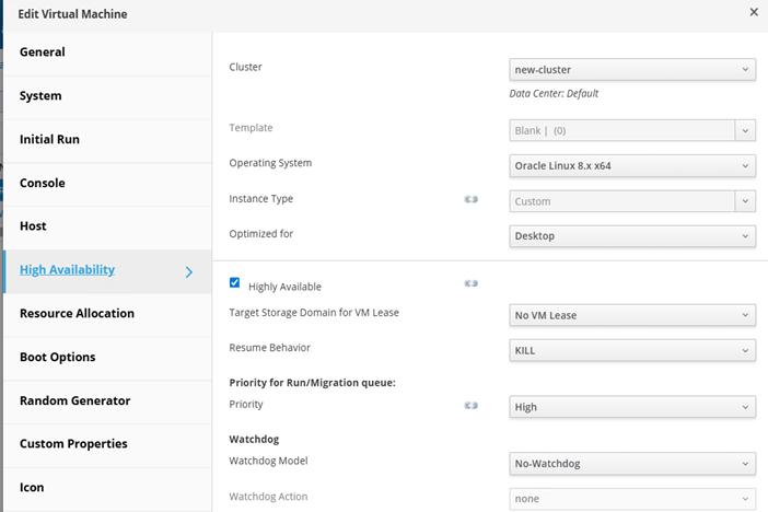 ·       Enable HA on the VMs. Navigate Compute, then Virtual Machines, click on edit and then configure High availability and Resource allocation. The following screenshots demonstrate options required to be configured.