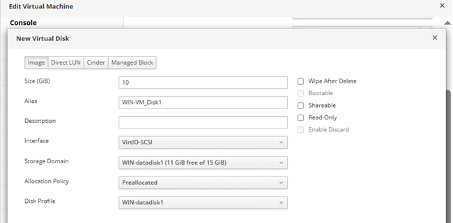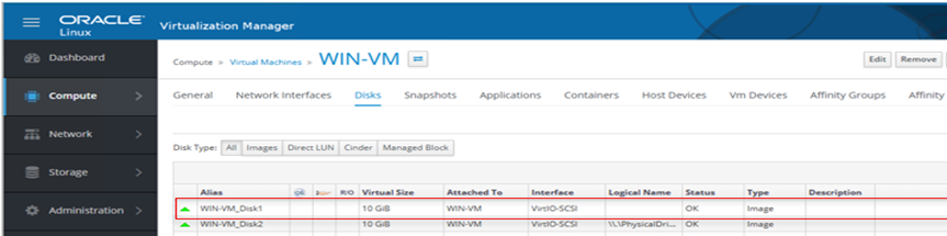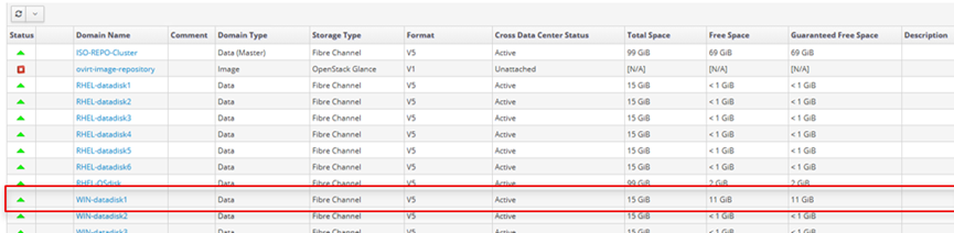 From the excerpt below, it is seen that WIN-datadisk1 storage domain has been assigned to VM “WIN-VM” as WIN-VM_Disk1.