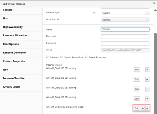 3.     Assign the newly created storage domain to VM using the procedure demonstrated below.