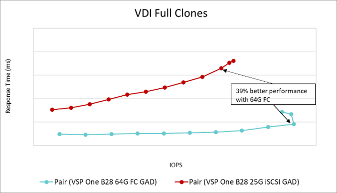VDI Full Clones achieved 39% higher throughput with 64G FC compared to 25G iSCSI.