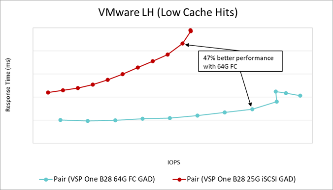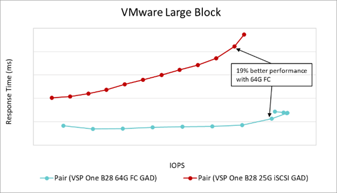 VMware Large Block achieved 19% higher throughput with 64G FC compared to 25G iSCSI.