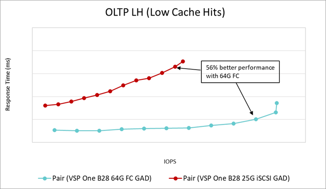 The OLTP HH workload achieved 76% higher throughput, while the OLTP LH workload delivered 56% higher throughput with 64G FC compared to 25G iSCSI.