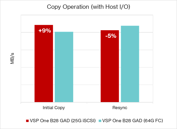 Even under active I/O load, the throughput pattern in both the operation remains similar compared to 64G FC, i.e. 9% higher in Initial copy and 5% lower in Resync.