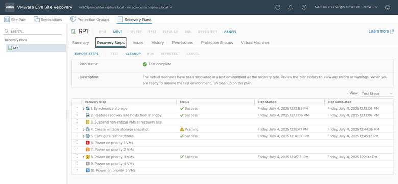 • Run a test recovery plan to validate VM migration and application availability.