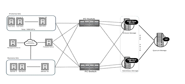 • Hitachi VSP One Block 20 arrays deployed at both sites for Primary and Secondary storage and one Hitachi VSP array for quorum device.