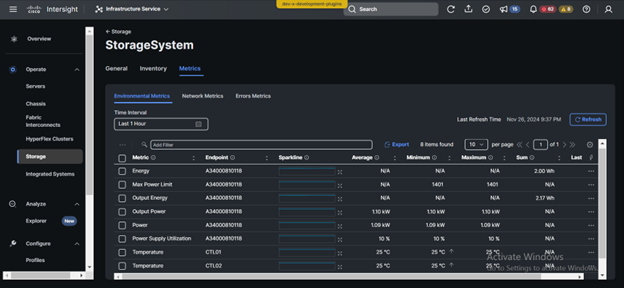 This upcoming feature enhancement will enable customers to view native Hitachi VSP energy, power draw, temperature, and other relatable metrics all from Cisco Intersight. This capability will enable IT professionals to gauge how efficiently their data center is operating and, if need be, make the appropriate remediation to stay on track with their sustainability goals. The following image represents the environmental metrics view of Hitachi VSP within Cisco Intersight.