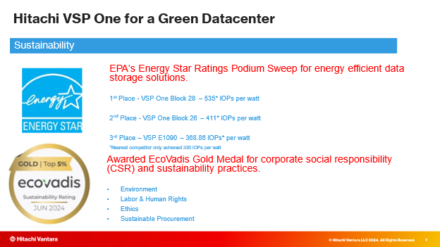 Hitachi Vantara as a premier storage vendor tackles this issue head on. With the release of our VSP One Block storage systems, we have set the industry standard for sustainability. With a podium sweep of 1st, 2nd, and 3rd, receiving the most efficient energy star ratings for a storage vendor we respectively provide the highest IOPs per watt operations at 535, with the closet competitor coming in at 330 IOPs per watt.