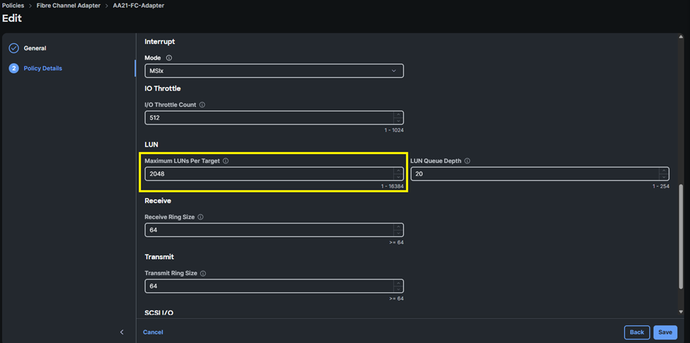 Within Cisco UCS environments, the Fibre Channel (FC) Adapter Policy defines the Maximum LUNs per Target. By default, this value is set to 1024, with a supported maximum of 16384.  As best practice, it is recommended to set a value of 2048 to align with Hitachi CSI LUN limits.