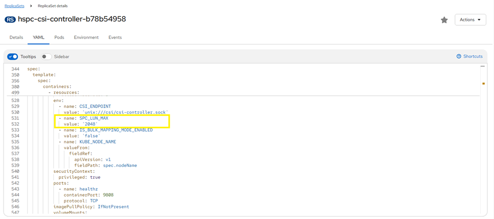 You can update the LUN configuration by modifying the SPC_LUN_MAX parameter. By default, 256 LUNs are supported. However, you can update the value for the SPC_LUN_MAX parameter to 2048. To change this parameter, follow steps from the Storage Plug-in for Containers Quick Reference Guide https://docs.hitachivantara.com/v/u/en-us/adapters/3.17.x/mk-92adptr142”, section “Editing the existing LUN configuration”.