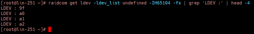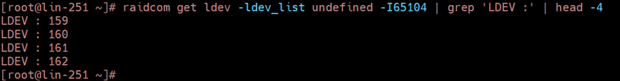 # raidcom get ldev -ldev_list undefined <horcm_instance> | grep 'LDEV :' | head <num_of_LDEVs_required>