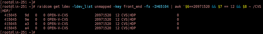 # raidcom get ldev -ldev_list unmapped -key front_end <horcm_instance> | awk '$6==<caps_in_block> && $7 == <pool_id> && $8 ~ <attribute_type>'