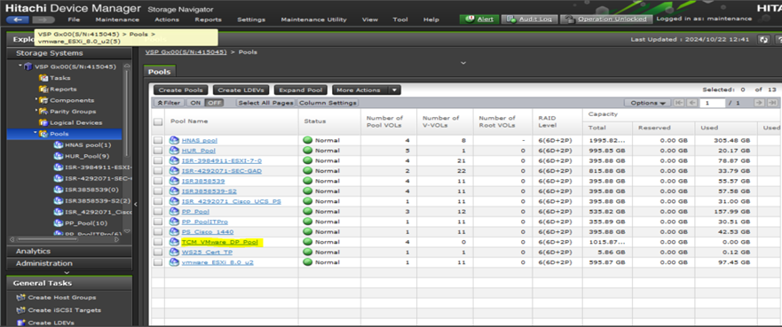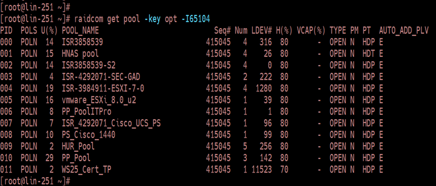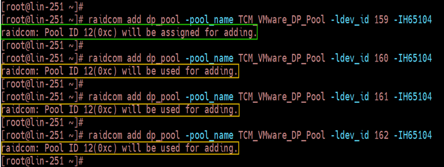 A pool named “TCM_VMware_DP_Pool” is created using LDEV ID 159 and assigned with a PID (Pool ID) of 012. When the same command runs with distinct LDEV IDs, instead of creating a new pool, the volume is assigned to the existing pool, as shown in the following screenshot: