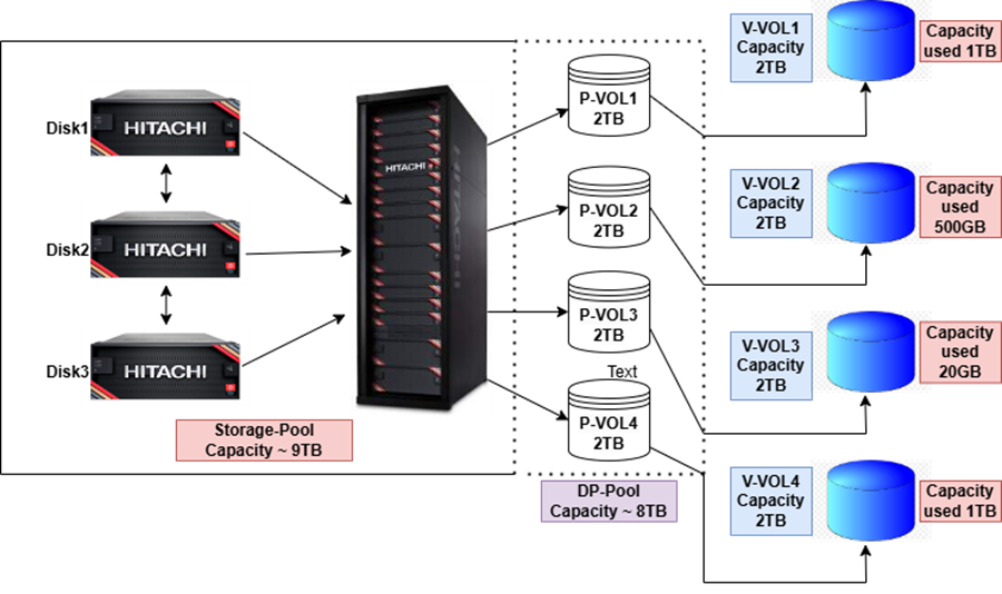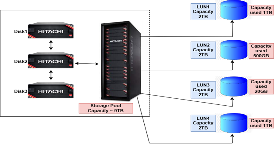 Example: The following screenshot shows a storage pool with a capacity of 9TB containing four thick LUNs, each of 2TB, reserving 8TB of space. However, the actual capacity used by all the virtual volumes (V-VOLs) is around 2.53TB. If the total data usage is only 2.53TB, 5.47TB of storage remains unused and wasted.
