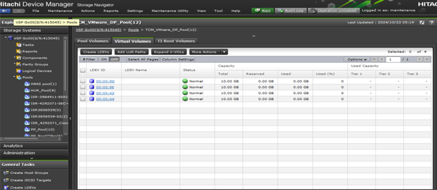 The following screenshot shows four V-VOLs, each with a capacity of 10GB, have been created. To assign names to these V-VOLs, use the raidcom modify command used in step 3.