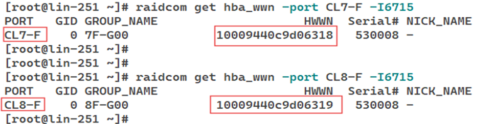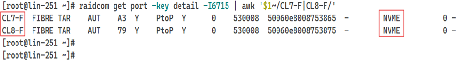 # raidcom get port -key detail -<horcm_instance> | awk '$1~/CL7-F|CL8-F/'