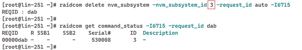 15. Finally, delete the NVM subsystem ID identified in Step 4, after confirming that all the previous cleanup steps have been completed successfully.