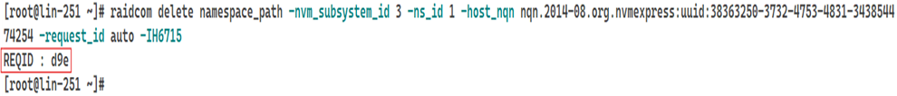 # raidcom delete namespace_path -nvm_subsystem_id <subsystem_id> -ns_id <namespace_id> -host_nqn <hostNQN> -request_id auto -<horcm_instance>