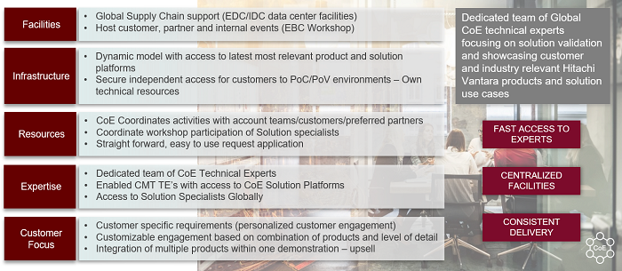 The Center of Excellence offers support which includes Demo`s, PoC`s and sales/pre-sales support functions.