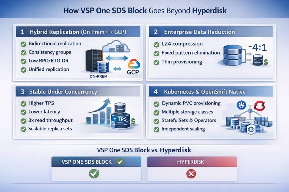 In this blog, we explore how VSP One SDS Block enhances OpenShift deployments on GCP and why it goes far beyond the capabilities of Hyperdisk.