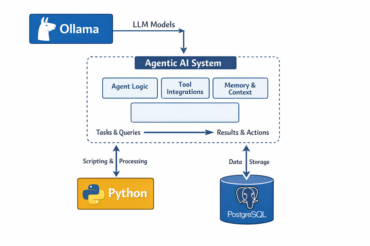 In this guide, we will walk through how to build an Agentic AI system using Python, Ollama (a modern AI model for decision-making and natural language tasks), and PostgreSQL (a relational database) to create a simple book recommendation agent. A local Ollama-based Agentic AI implementation offers better data privacy and security since all processing happens on-premise without sending sensitive information to the cloud. It also reduces latency and ongoing costs by eliminating internet dependency and cloud usage fees.