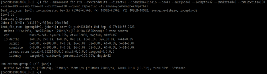 Fio –name=Test_fio_run - -rw=randwrite - -direct=1 - -ioengine=libaio - -bs=4k - -numjobs=1 - -iodepth=32 - -rwmixread=0 - -rwmixwrite=100 - -size=10G - -ramp_time=60 –runtime=120 –group_reporting -filename=/dev/mapper/mpathak