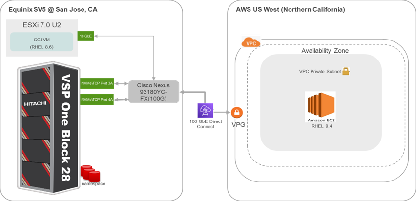 The following figure shows the hybrid cloud environment with Hitachi VSP One Block 28 and AWS EC2 running RHEL 9.4 with NVMe/TCP configuration over 100G Direct Connect: