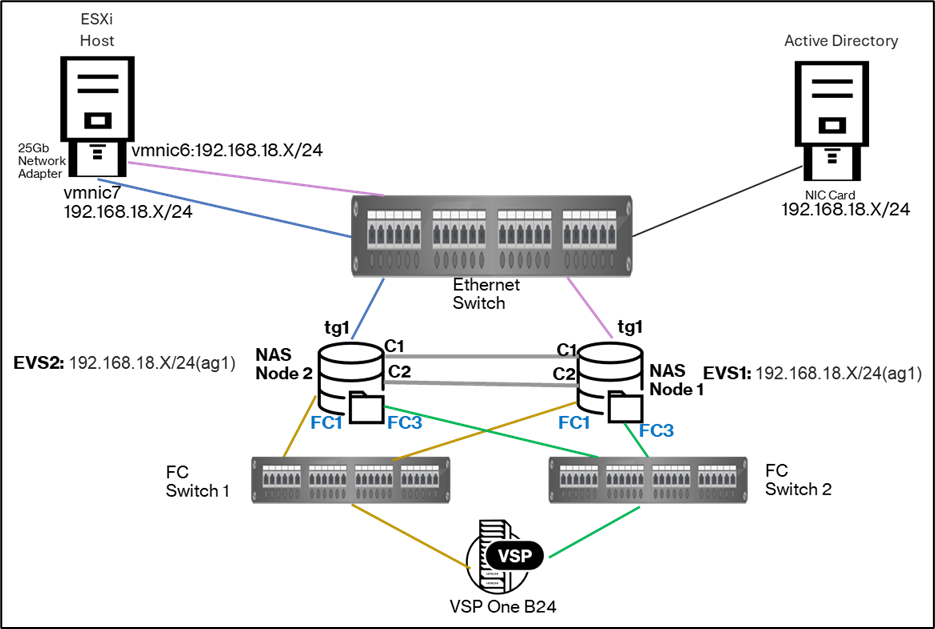 · Backend Storage: Hitachi VSP One B24, serving as the disk storage for the NAS server.