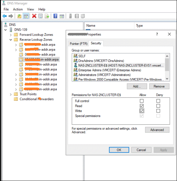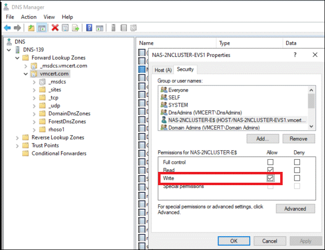 - If the datastore isn’t writable after creation, open the DNS Manager on the Active Directory server. In both the forward and reverse lookup zones, update the host security settings to grant write access. Refer to the example shown below for forward and reverse lookup configuration.