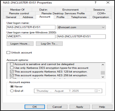 nfs/NAS-2NCLUSTER-EVS1.vmcert.com@VMCERT.COM 3 AES256: HMAC-SHA1-96