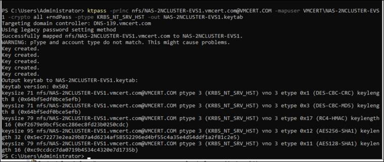 ktpass -princ nfs/NAS-2NCLUSTER-EVS1.vmcert.com@VMCERT.COM -mapuser VMCERT\NAS-2NCLUSTER-EVS1 -crypto all +rndPass -ptype KRB5_NT_SRV_HST -out NAS-2NCLUSTER-EVS1.keytab