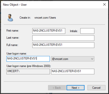 b. Create a new user (e.g., NAS-2NCLUSTER-EVS1).
