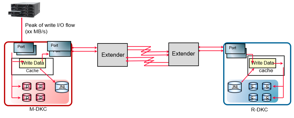 - To prevent performance deterioration of the host write I/O, a public line with sufficient bandwidth is required. The links between M-DKC and R-DKC must provide sufficient bandwidth to support the average throughput of the host write.