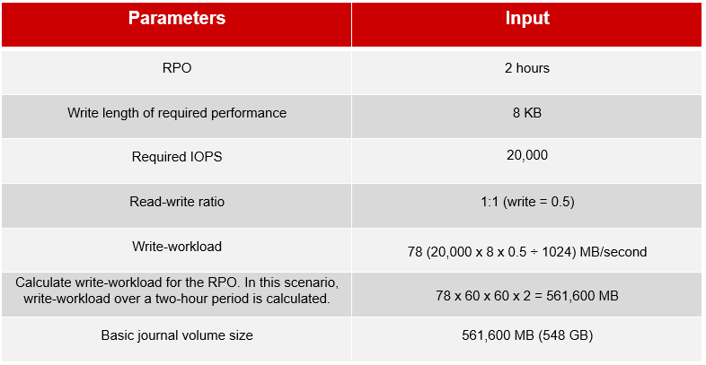 Journal volume capacity is determined considering worst-case scenarios, such as link failure between two data centers. The following table is an example of calculating the required journal volume capacity using a 50% 8KB write-workload and RPO.