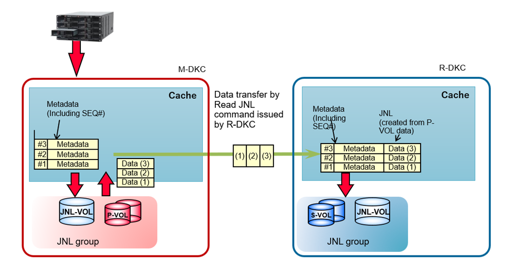 - In the M-DKC, both the metadata area and the write data area are allocated when metadata is created for incoming write data. Both areas are released after it receives notification from the R-DKC that copying to the S-VOL has completed.