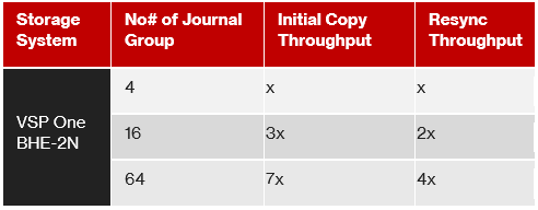 The following example shows how Initial Copy and Resynchronization throughput increase as the number of JNL groups are increased on a VSP One Block High End 2N configuration using medium copy pace.