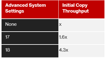 By enabling Advanced system Settings #17 copy pace becomes one level faster (~150%) than medium copy pace. By enabling Advanced system Settings #18 copy pace becomes two levels faster (~400%) than medium copy pace. These two settings control how faster journal meta data is created which in turn enhances the copy pace. Here is an example with VSP One Block High End 2N storage system.