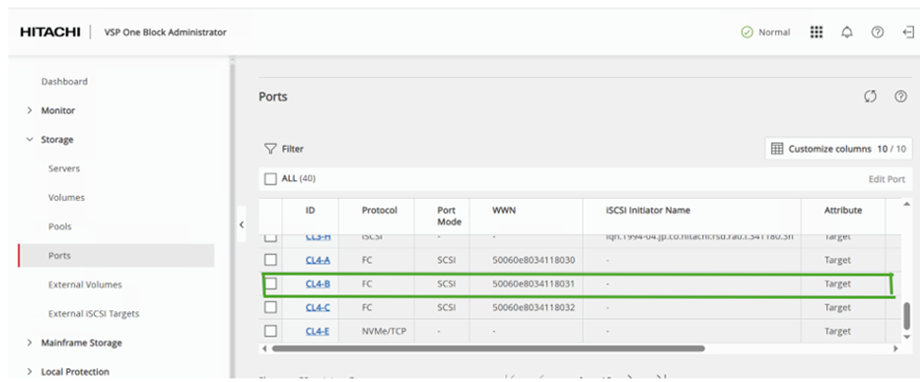 6. Next, click again on Add Boot Device and then select SAN-Boot from the drop-down list. Give device name and interface name “fc0”. Keep “0” for the Boot Target LUN. Enter the WWN of the port through which the Hitachi storage LUN will be accessed for SAN-Boot. To get the required port WWN, log in to the VSP One Block Administrator and navigate to the port settings as shown below.