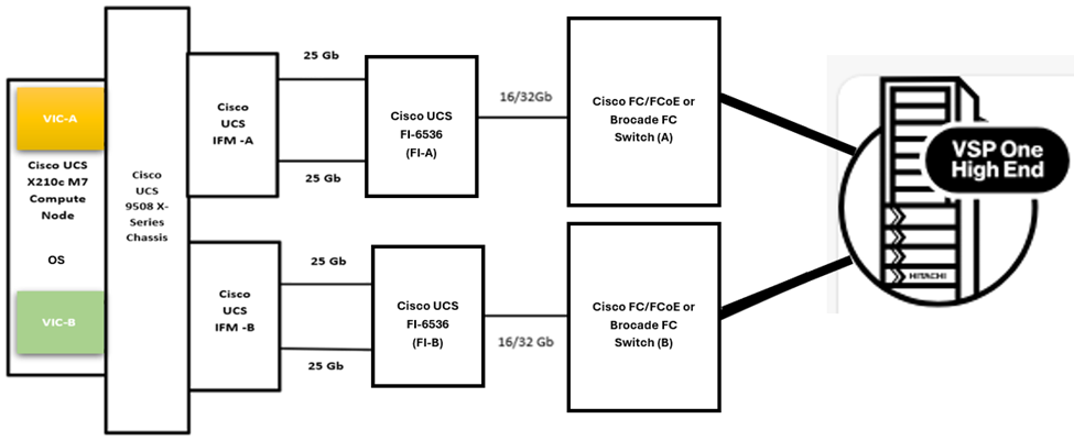 The following figure illustrates a VSP One BHE storage system and a host equipped with a dual-port Fibre Channel adapter. One FC port is directly connected to the VSP One BHE target port CL3-B, while the other FC port connects to the CL4-B target port via the FI-6536 Fabric Interconnect and Cisco upstream switches. Through ports CL3-B and CL4-B, the Cisco UCS server accesses the storage LUN.