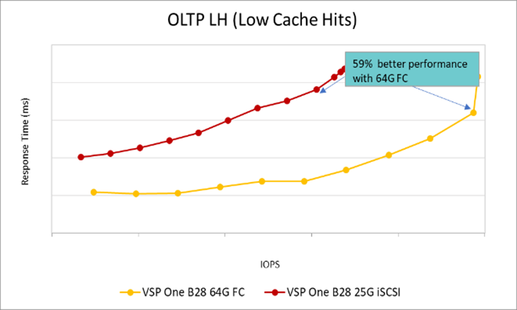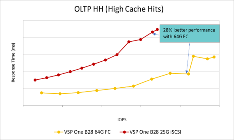 The OLTP HH workload achieved 28% higher throughput, while the OLTP LH workload delivered 59% higher throughput with 64G FC compared to 25G iSCSI.