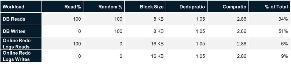 This workload mimics the I/O profile of an Oracle database. It uses four constituent sub-profiles which are run together.