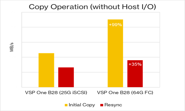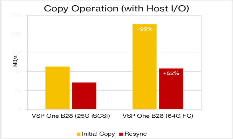 64G FC delivers nearly double the throughput of 25G iSCSI in Initial Copy (IC) and 35%- 50% in Resync operations.