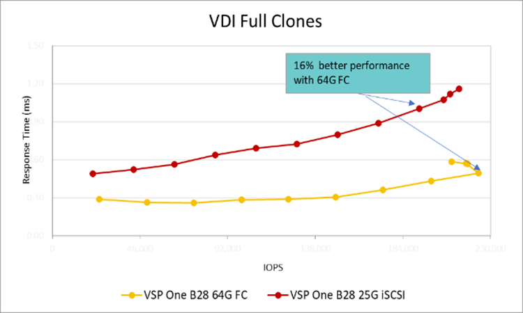 VDI Full Clones achieved 16% higher throughput with 64G FC compared to 25G iSCSI.