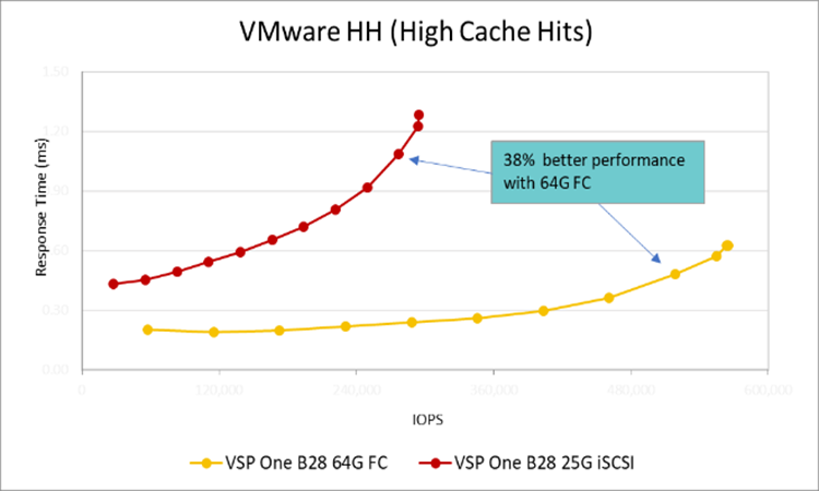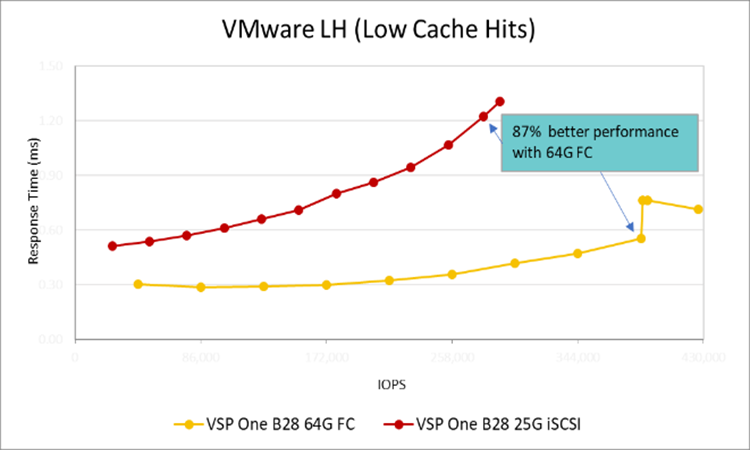 The VMware HH workload achieved 38% higher throughput, while the VMware LH workload delivered 87% higher throughput with 64G FC compared to 25G iSCSI.