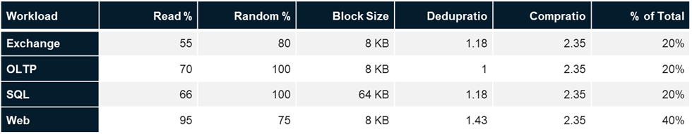This workload mimics four common VMware applications. Volumes are provisioned in sets of five: one Exchange, one OLTP, one SQL and two web volumes.
