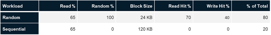 This workload mimics an aggregated I/O profile of storage system running mostly VMware. It uses two constituent sub-profiles which are run together.